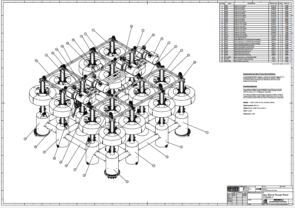Plataforma Calma, autogestionada, potencia nominal de 6 MW y sumergible en temporales con olas superiores a 4,5 m de Hs.